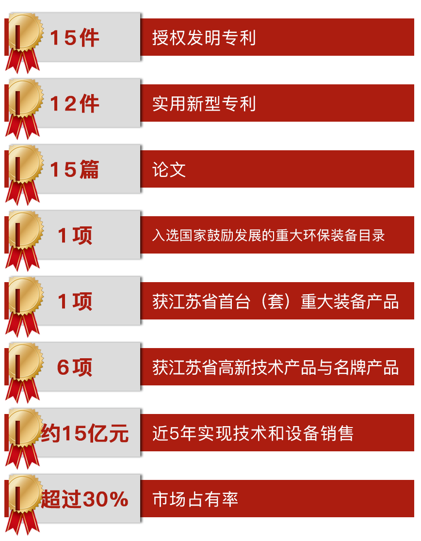 项目获授权发明专利15件,实用新型专利12件,论文15篇,装备入选国家鼓励发展的重大环保装备目录1项,获江苏省首台(套)重大装备产品1项,获江苏省高新技术产品与名牌产品6项。项目近5年实现技术和设备销售约15亿元,市场占有率超过30%。