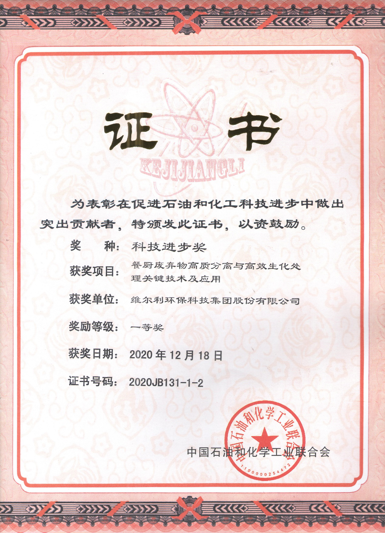 由维尔利环保科技集团股份有限公司、常州大学和常州市生活废弃物处理中心联合申报的《餐厨废弃物高质分离与高效生化处理关键技术及应用》,经过初评,专家评审和远程视频答辩等环节,获得各级评审专家的认可和赞许,在本次申报中喜获中国石油和化学工业联合会科技进步奖一等奖。